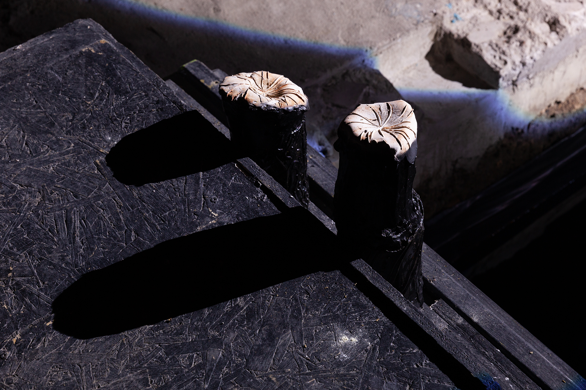 Incense (sawdust from cherry, chestnut and pine, incense beans, dried roses, incense essence, charcol grounded, diluted gum arabic, pigments and alcohol on plaster supports) on plaster sculptures. 2021