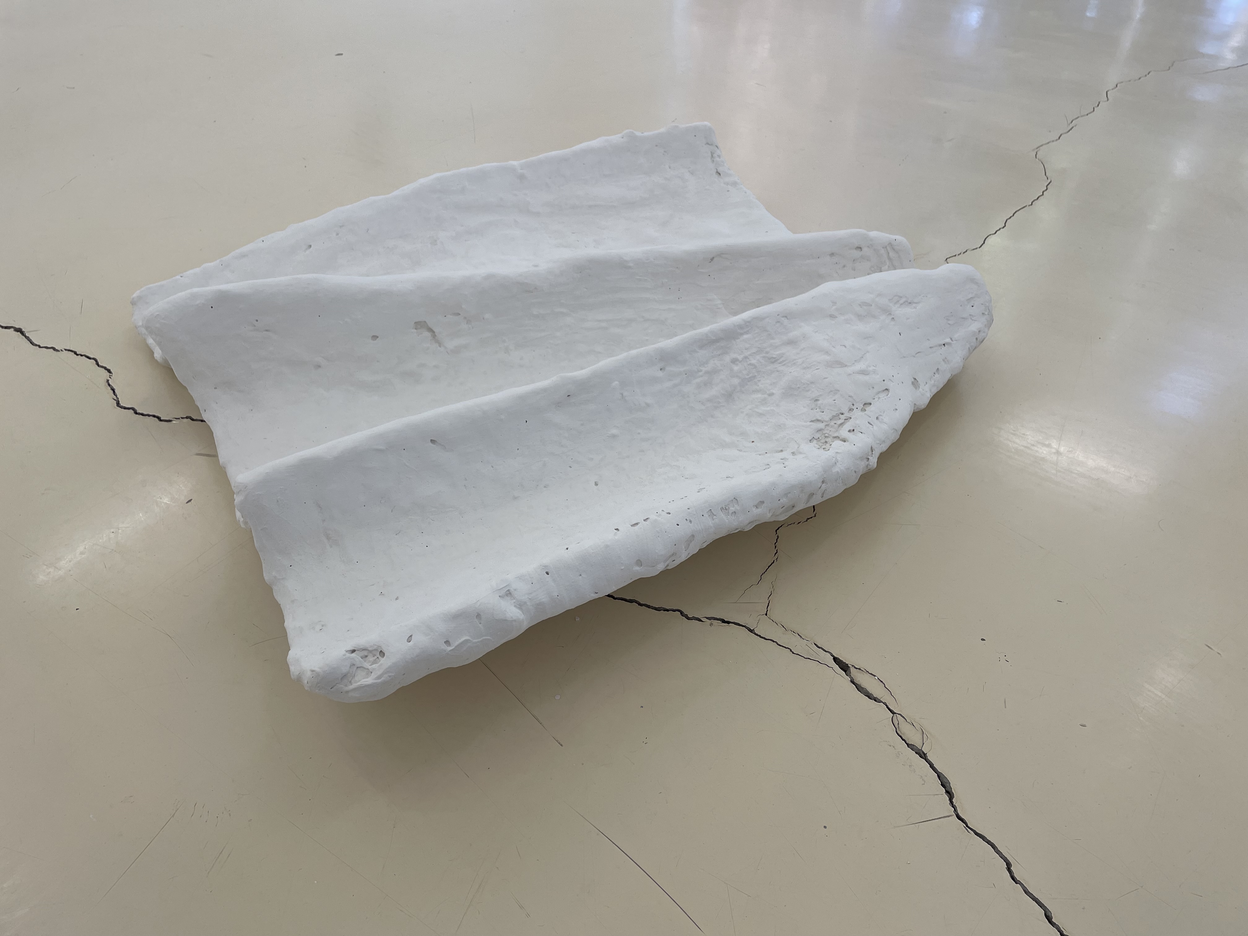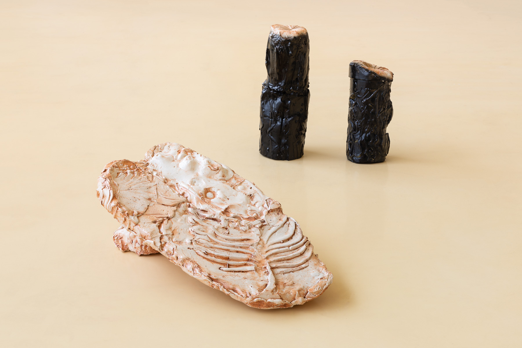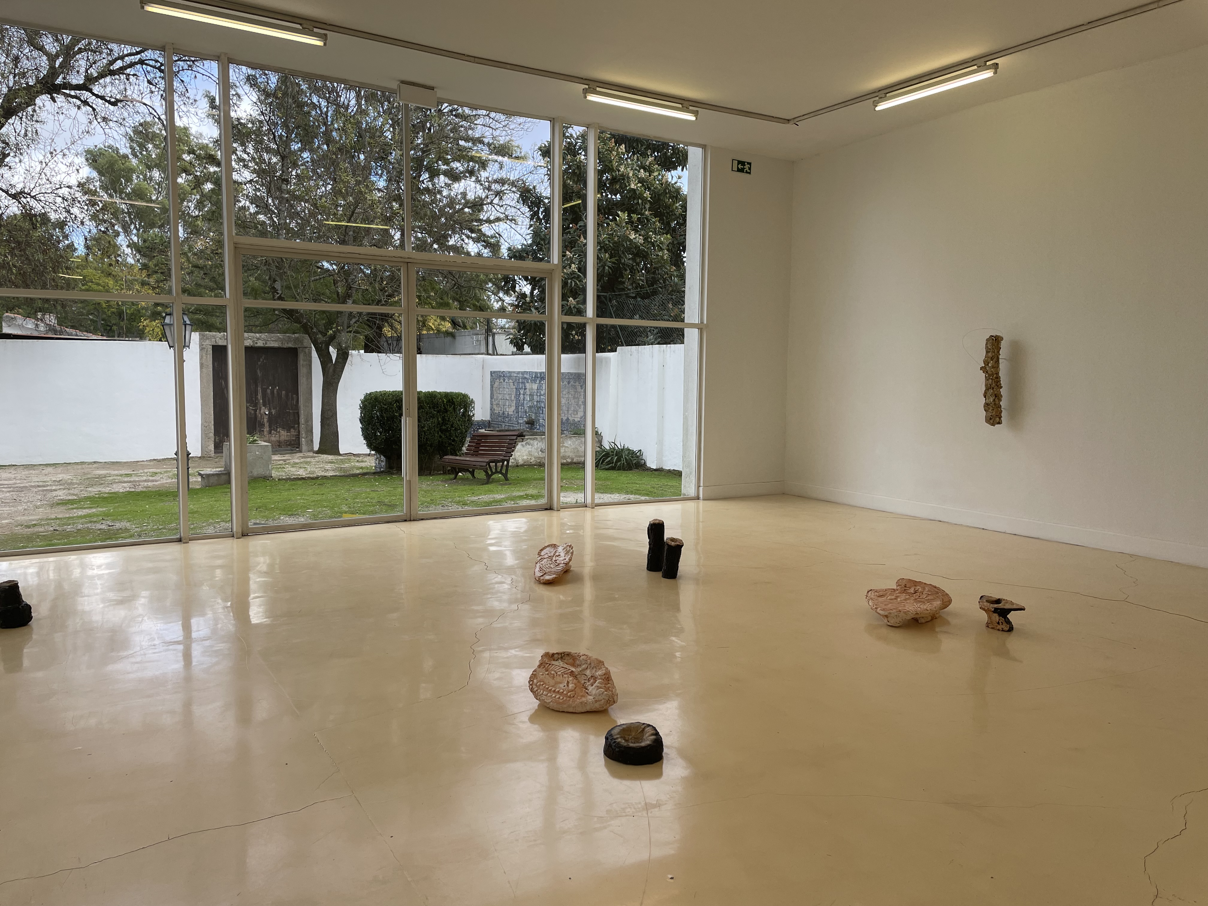 link | info | handout | captionsThe sculptures by Isabel Carvalho exhibited here form part of a recent body of work developed in plaster and shaped in experimental moulds. Creating forms inspired by organic structures and physiological components, these sculptures depart from the human body as a component of the modelling process, that leaves the plaster with an imprint of the artist’s gestuality. These oracular censers contain traces of burnt incense and other substances (such as sawdust from cherrywood, chestnut and pine, specks of incense, dried roses, essence of incense, ground charcoal, diluted gum arabic, and pigments), as well as powdered gold which is applied to the painted plaster. Some of these sculptures might emit smoke during the exhibition when their resins are ignited, turning them incandescent as they evoke the turbulent magnetism of fire.
