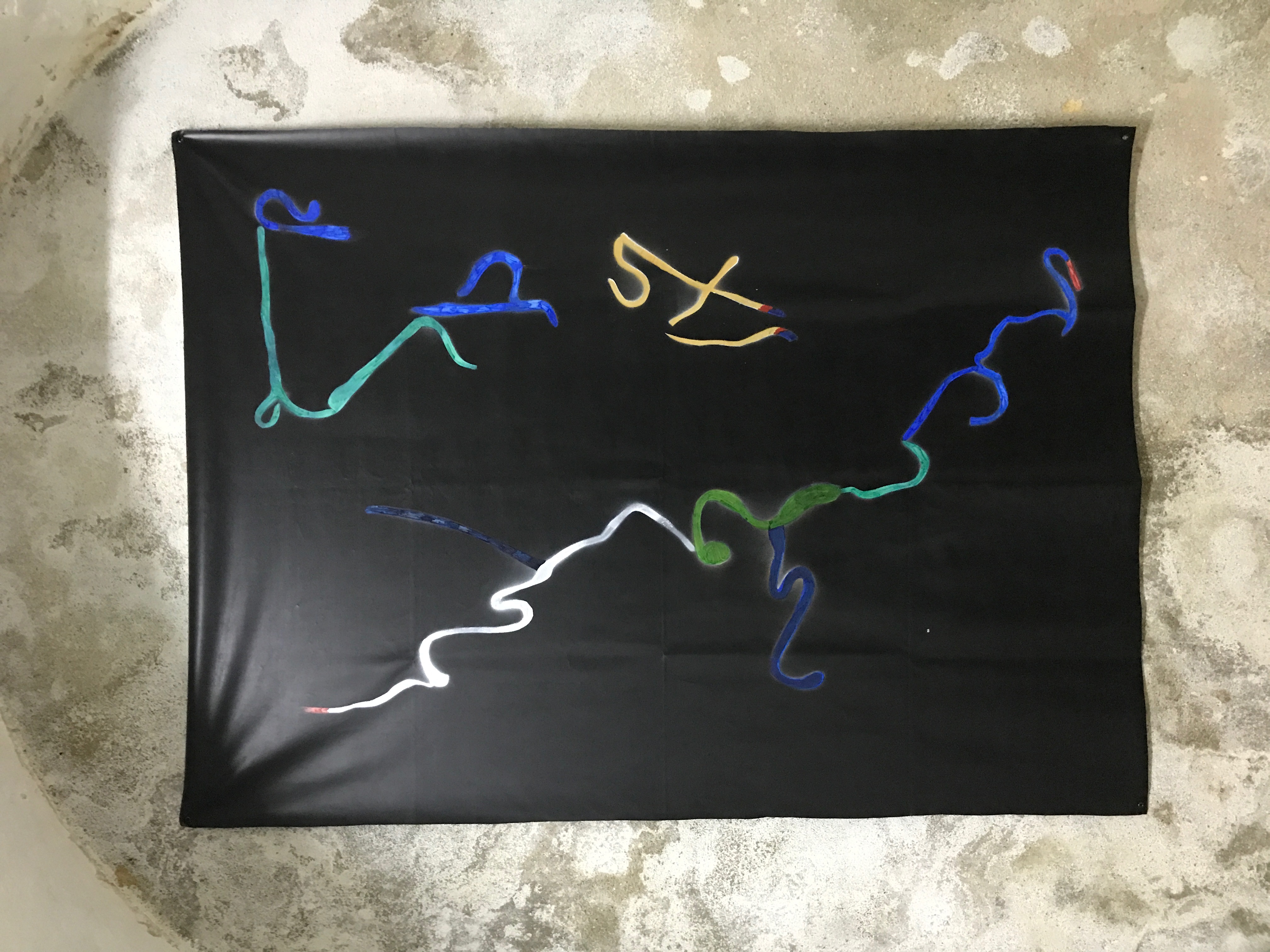 Clay, acrylic spray and color markers on black cloth